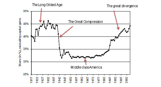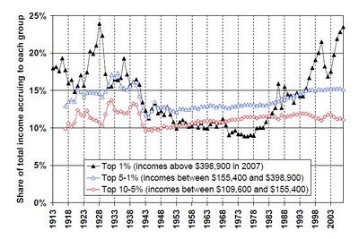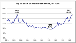 The following graph (ref) plots share of income held by the top 1% of income earners in this country between 1913 and 2007.
