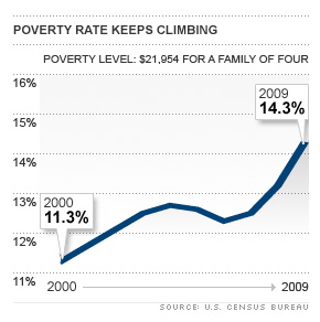 This reliance on food stamps parallels the escalation in poverty (ref). The most current census estimates have 43.6 million Americans, 14.3% of our population, living in poverty in 2009. However, a recent study by the National Academy of Science places the figure at almost 53 million. Using the census figures, 15.5 million of these individuals were children (1 child out of every 5). The poverty rate amongst children increased 28% since 2000, and jumped 10% from 2008-2009 during the heart of the Great Recession. Every day in America 2,573 babies are born into poverty (ref).