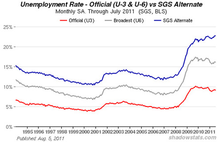 There has been a marked increase in unemployment following the Great Recession as noted in the following graph (ref). The U3 is the official monthly headline number. The U6 is the Bureau of Labor Statistics broadest unemployment measure including short-term discouraged, other marginally-attached workers, and those forced to work part time because of lack of full-time employment. The SGS Alternative (ref) is an aggregate of U3 and U6 and additonally includes long-term discouraged workers ‘who are unemployed and want to work, but have not looked for work within the past year’. These individuals were excluded from the official count in the 1990’s. The SGS gives an unemployment rate of 22.5%, an all time record of 34 million people currently in need of work.