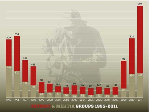 But the truly stunning growth came from anti-government “Patriot”/militia movement that views the government as their primary enemy. These groups formed in the mid-1990’s based on the perception of violent government repression of dissident groups at Ruby Ridge, ID in 1992 and near Waco, TX in 1993. The Oklahoma City bombing in 1995 is attributable to this movement which peaked a year after the incident and then rapidly declined. But the movement was once again energized in 2008 with the economic recession and the appearance of Barack Obama as a presidential candidate. The numbers of these groups rose from 149 in 2008 to 1,274 last year. Of these, 334 were militias. A state by state listing of these groups is provided here. A graph produced by SPLC showing the meteoric growth of such groups is displayed below.