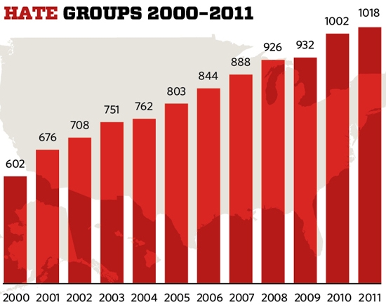 Over 1000 hate groups have been counted by SPLC, up from 602 in 2000, the rise being attributed to the successful exploitation of non-white immigration, president Obama’s election, and the economic recession. Indeed, it was when the Great Depression hit Germany in the 1930’s that voice was given to far right extremism (fascism): marked by an ultranationalism (a reclaiming of the country that had been lost); defining those who fit and did not fit; portraying those who did not fit as the cause of problems, referring to them as vermin, cancers (or today, moochers and takers who want stuff?); and, ultimately “eliminationism” (a politics and a culture that shuns dialogue and the democratic exchange of ideas in favor of the pursuit of outright elimination of the opposing side, either through suppression, exile and ejection, or extermination) – reviewed here.