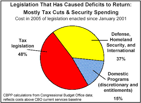 In 2001, GW Bush once again put into place the Reagan approach of lowering tax rates while increasing military spending – a formula that rapidly turned record surpluses into record deficits. Those two elements accounted for 85% of the then record deficits by the year 2005.