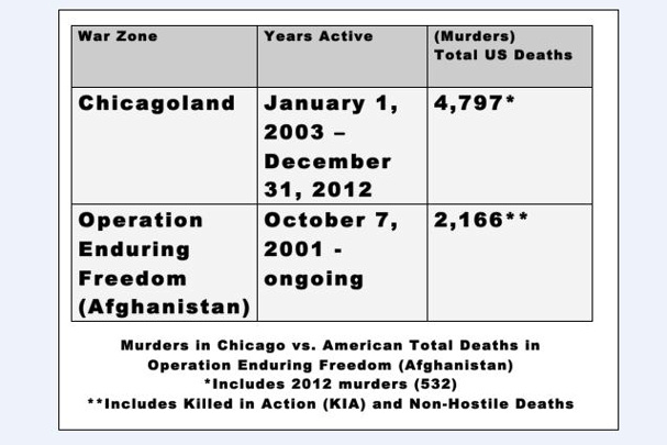 Police analyses have shown that the death toll by murder in Chicago (January 1, 2003 – December 31, 2012) was greater than the number of American forces who have died in Afghanistan since the beginning of Operation Enduring Freedom (October 7, 2001 – ongoing).
