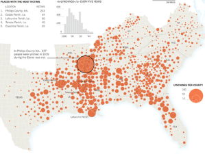 The Equal Justice Initiative (EJI), founded by attorney Bryan Stevenson, recently released a report on the history of black lynchings in the United States: Lynching in America.  Confronting the Legacy of Racial Terror.  The report was the result of five years of research and uncovered nearly 4000 victims of “racial terror lynching” in 12 Southern sates between 1877 and 1950 (to put the hatred witnessed on Bloody Sunday into perspective, the documentation in the EJI report ended in close proximity to that event).  The graphic depiction below showing the location of these lynchings is excerpted from a NY Times article.